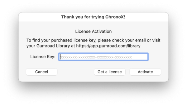 Open the DMG package and drag and drop ChronoX.app to the Applications folder.