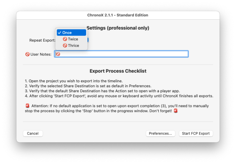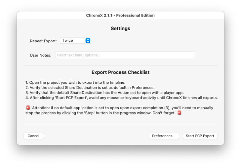 These settings serve as prerequisites for ChronoX to function properly. If the "Action: Open With.." setting is not configured, ChronoX will be unable to complete its tasks, requiring manual intervention by clicking the "Cancel" button. Since ChronoX cannot verify these FCP configuration settings, it's essential to double-check and ensure they are correctly configured.