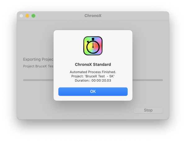 IMPORTANT: After clicking OK button DO NOT TOUCH MOUSE and KEYBOARD until ChronoX finish to run all the export!