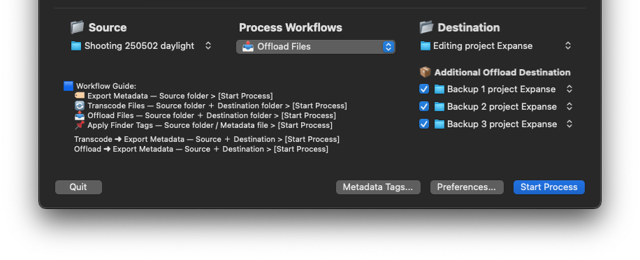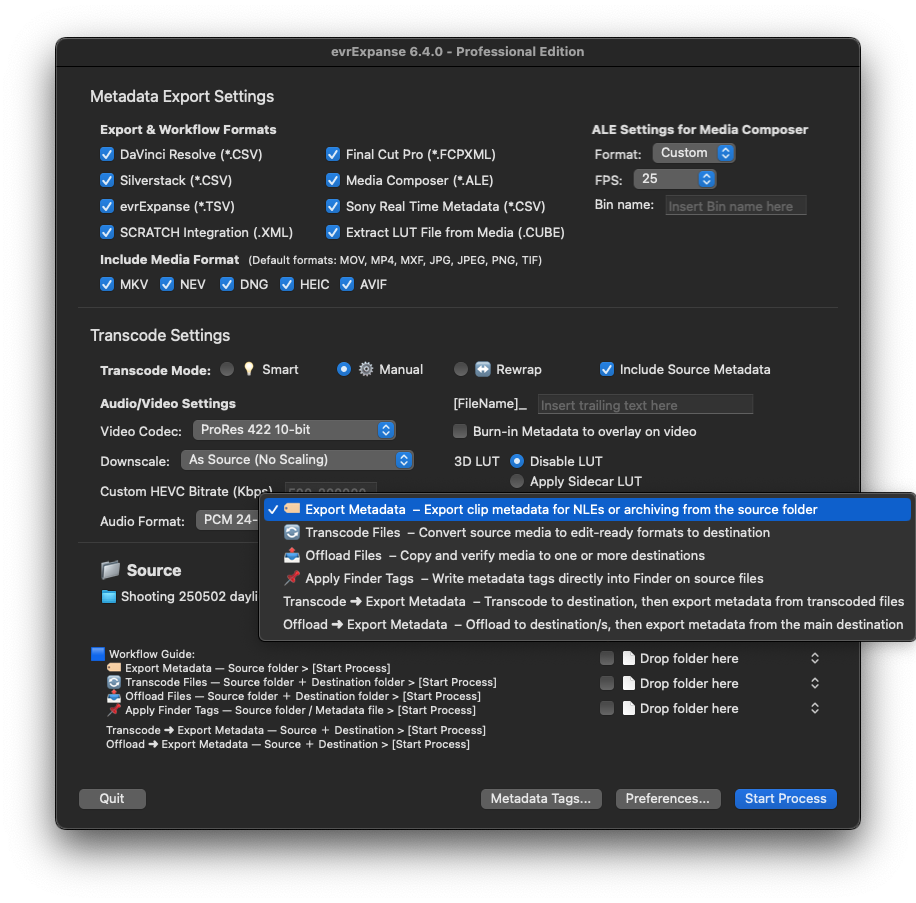When the Offload ➜ Export Metadata process is selected, evrExpanse streamlines your media workflow by efficient combining the Offload and Export Metadata tasks into a single, efficient operation. With just one click, you can transfer media files and export metadata at the same time, reducing time and effort. This feature not only boosts productivity but also preserves essential metadata, ensuring that both the offloaded files and metadata are ready for further analysis and integration into other applications, including NLEs such as Final Cut Pro®, DaVinci Resolve®, and Assimilate SCRATCH®..
